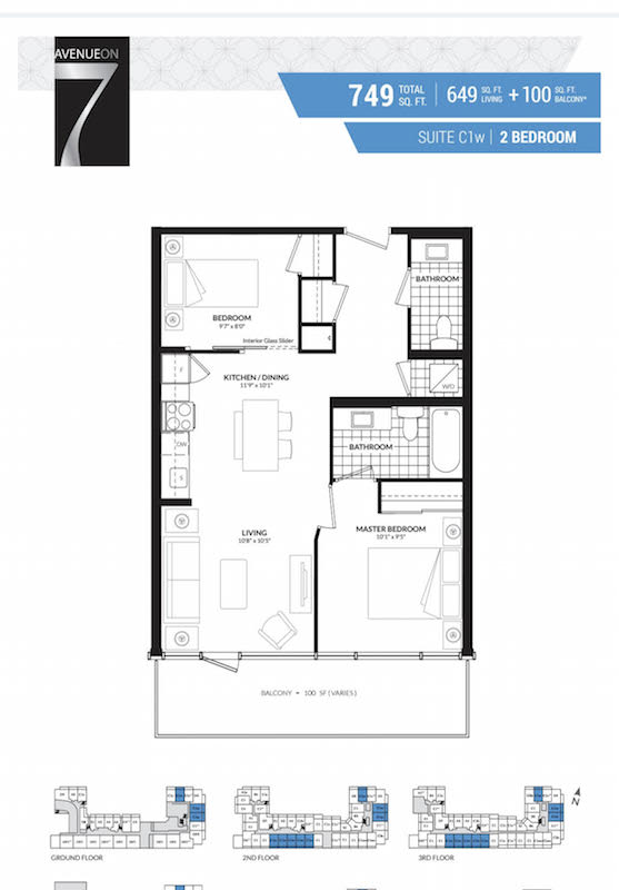 Avenue on 7 Condos Unit is a 2 bedroom/1.5 bathroom, 749 SqFt Total (649 SqFt living + 100 SqFt balcony) for sale as assignment for $479,900